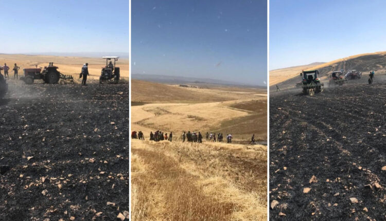 Çiftçilerin yoğun çabası sonucu yangın kontrol altına alıp söndürülürken, 100 dönüm buğday ve arpa küle döndü.