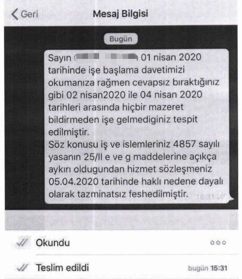 İzmir’de hizmet veren bir otel, bu durum doğrultusunda yeniden hizmet verme kararı alarak, izne çıkardığı personelleri Whatsapp üzerinden geri çağırdı. Bazı personeller yapılan çağrı üzerine işlerine geri dönerken, bazı personeller ise sağlık açısından ne gibi önlemler alındığını sorgulayarak ve WhatsApp üzerinden yapılan çağrılmanın geçerli olmadığını iddia ederek işlerine geri dönmedi. Bazı otel personellerinin yapılan tüm uyarılara rağmen, çağrılara kulak asmayarak işe gelmemesi sonucu otel yönetimi, bu personellerin iş akdine son verdi. İşten çıkartılan personeller ise soluğu mahkemede aldı.